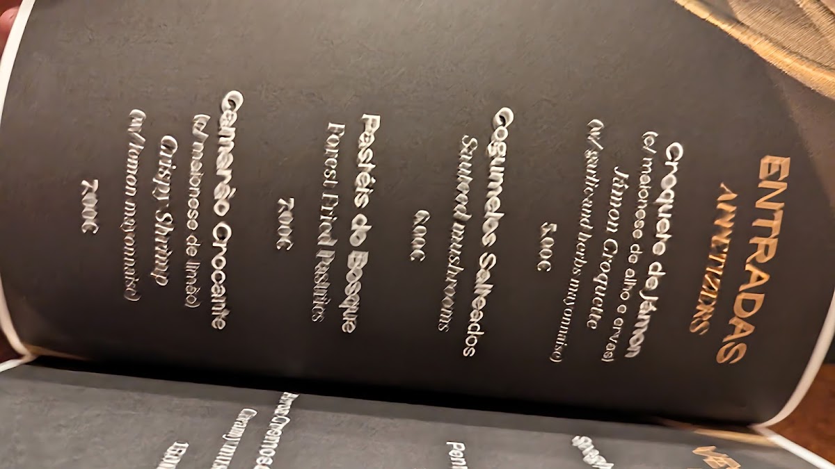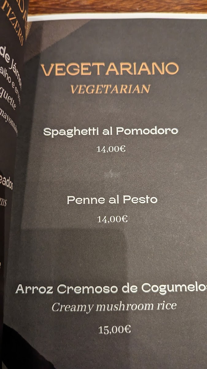 Vegetarians and vegans will find satisfying options in the Vegetariano / Vegan section, such as the Arroz cremoso de tomate (creamy tomato rice) and the earthy Risotto de cogumelos (mushroom risotto), both full of flavor and texture.